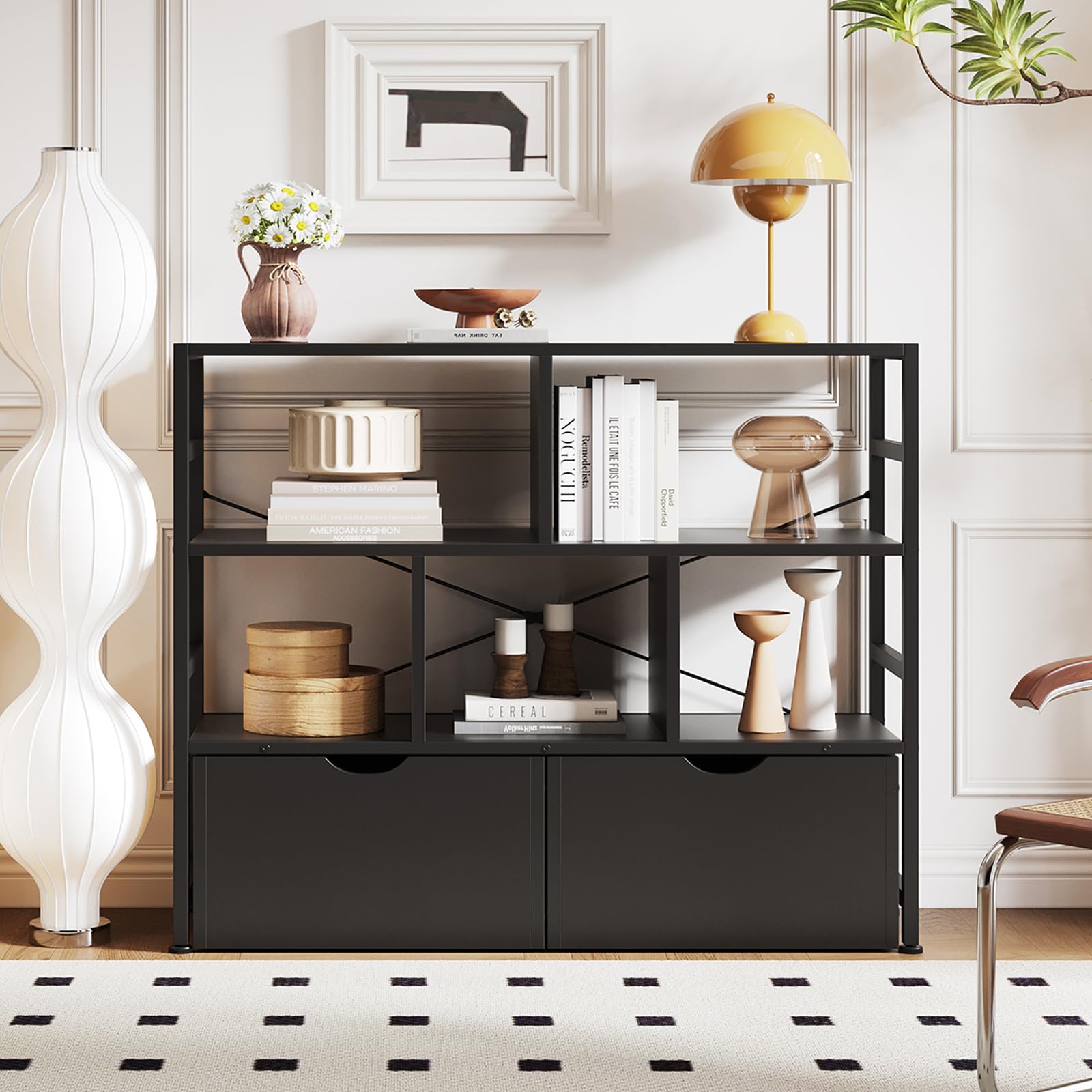 Dripex 4 Tier Bookcase with 2 Movable Drawers,Wooden Floor Standing Book Shelf with Steel Frame, Black Storage Display Shelf for Living Room, Bedroom or Office