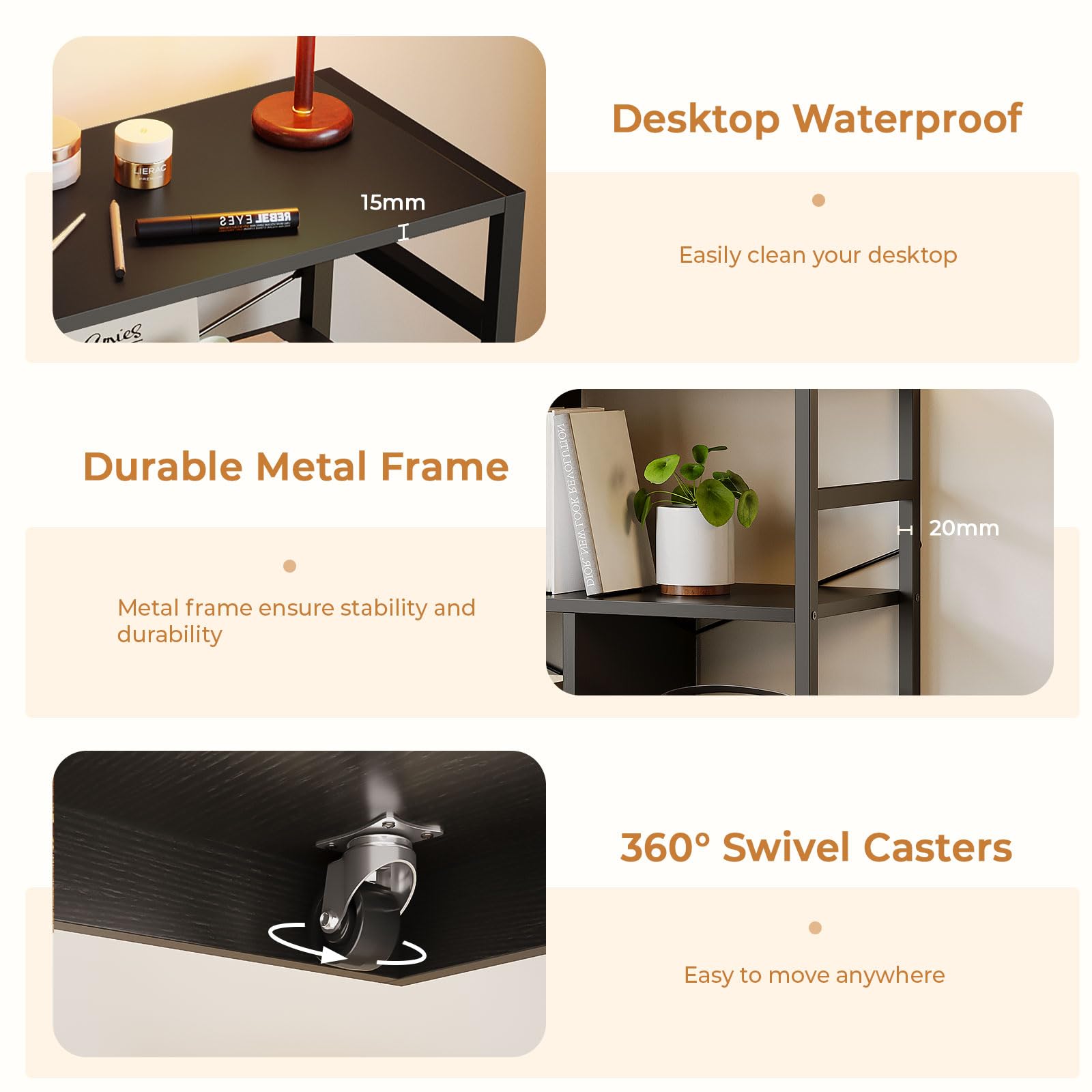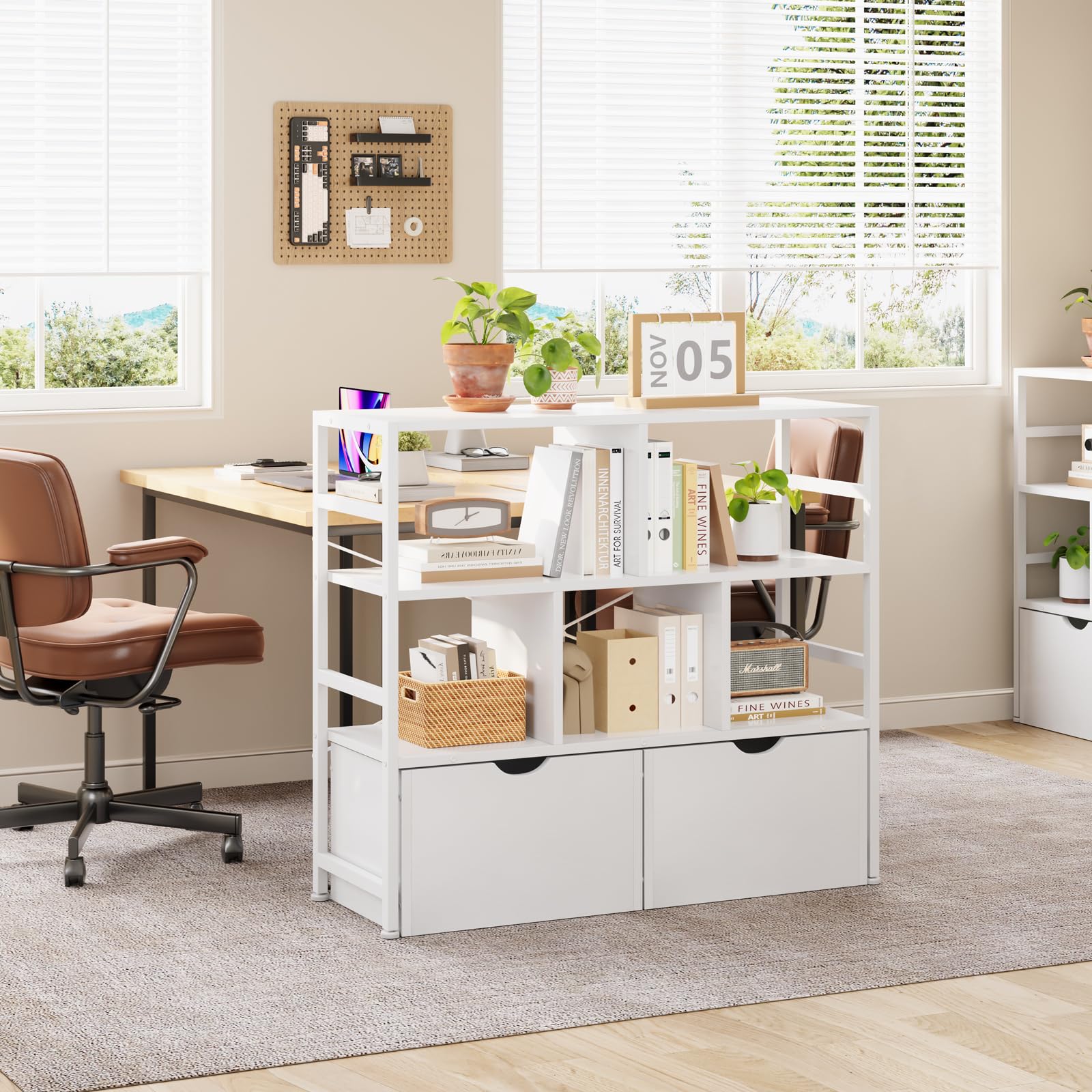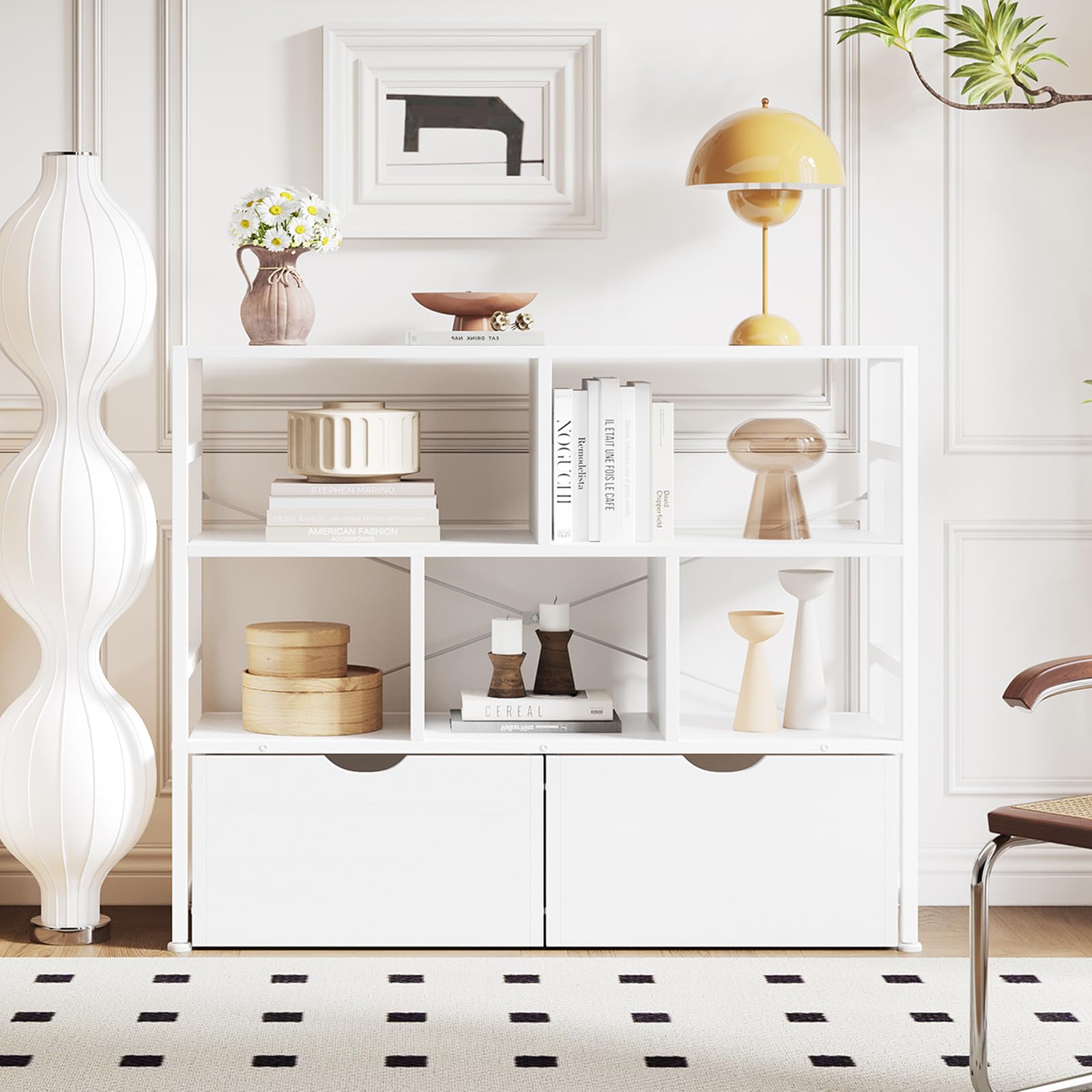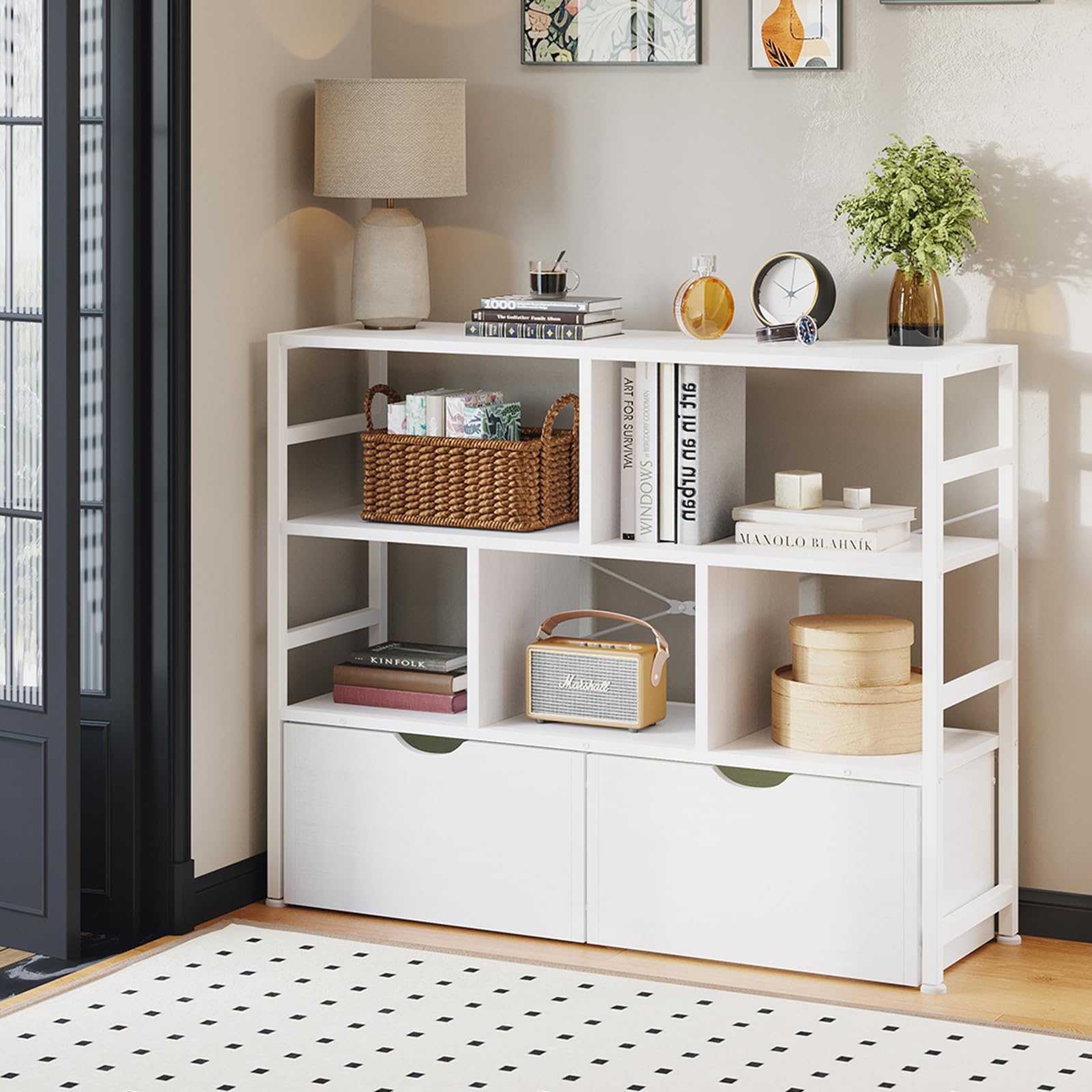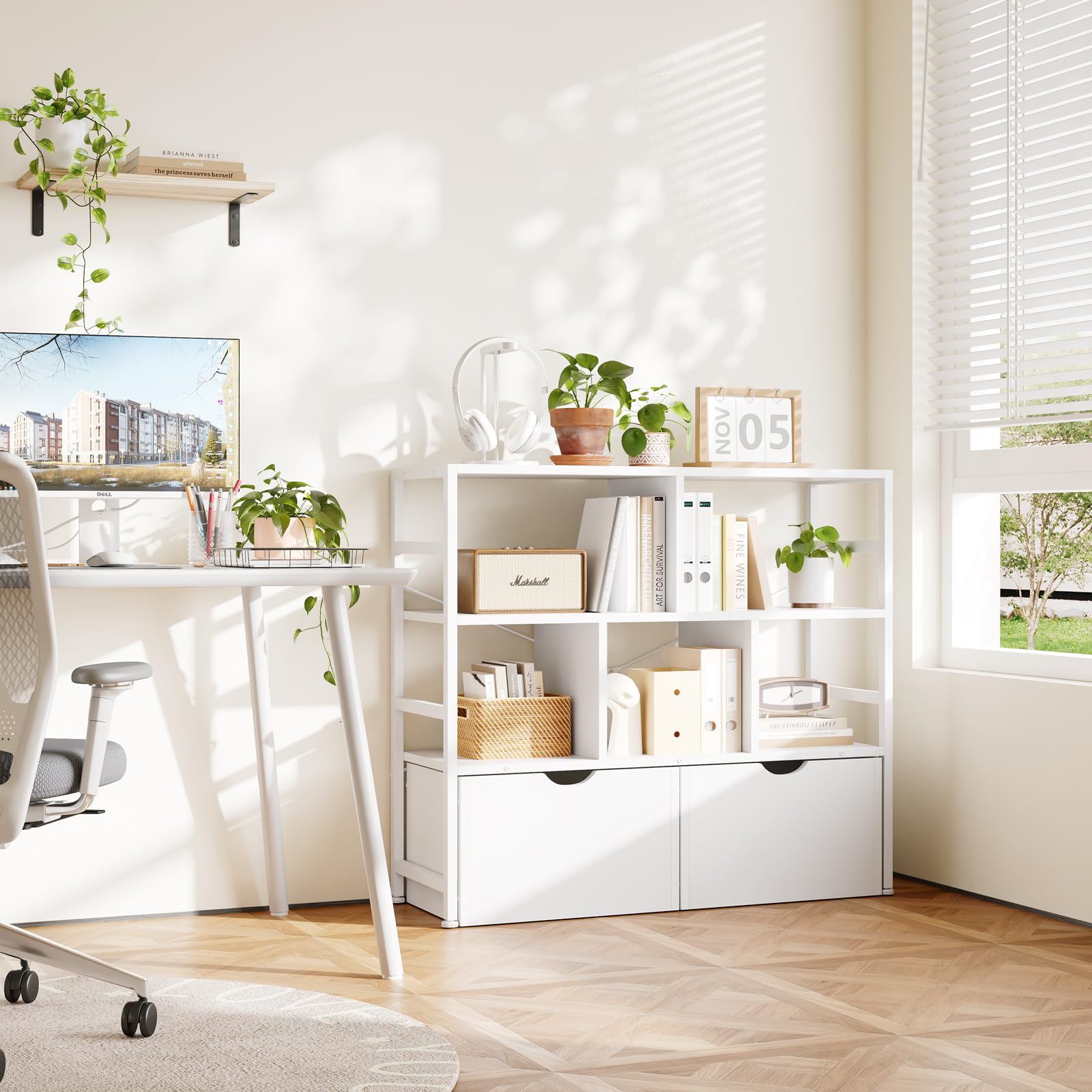 - 【Space Saving】5 display shelf and 2 closed drawers with universal wheels are carefully planned according to the daily living habits of the bookshelf, which can not only meet the needs of displaying and storing items, but also enhance the space utilisation and aesthetics.