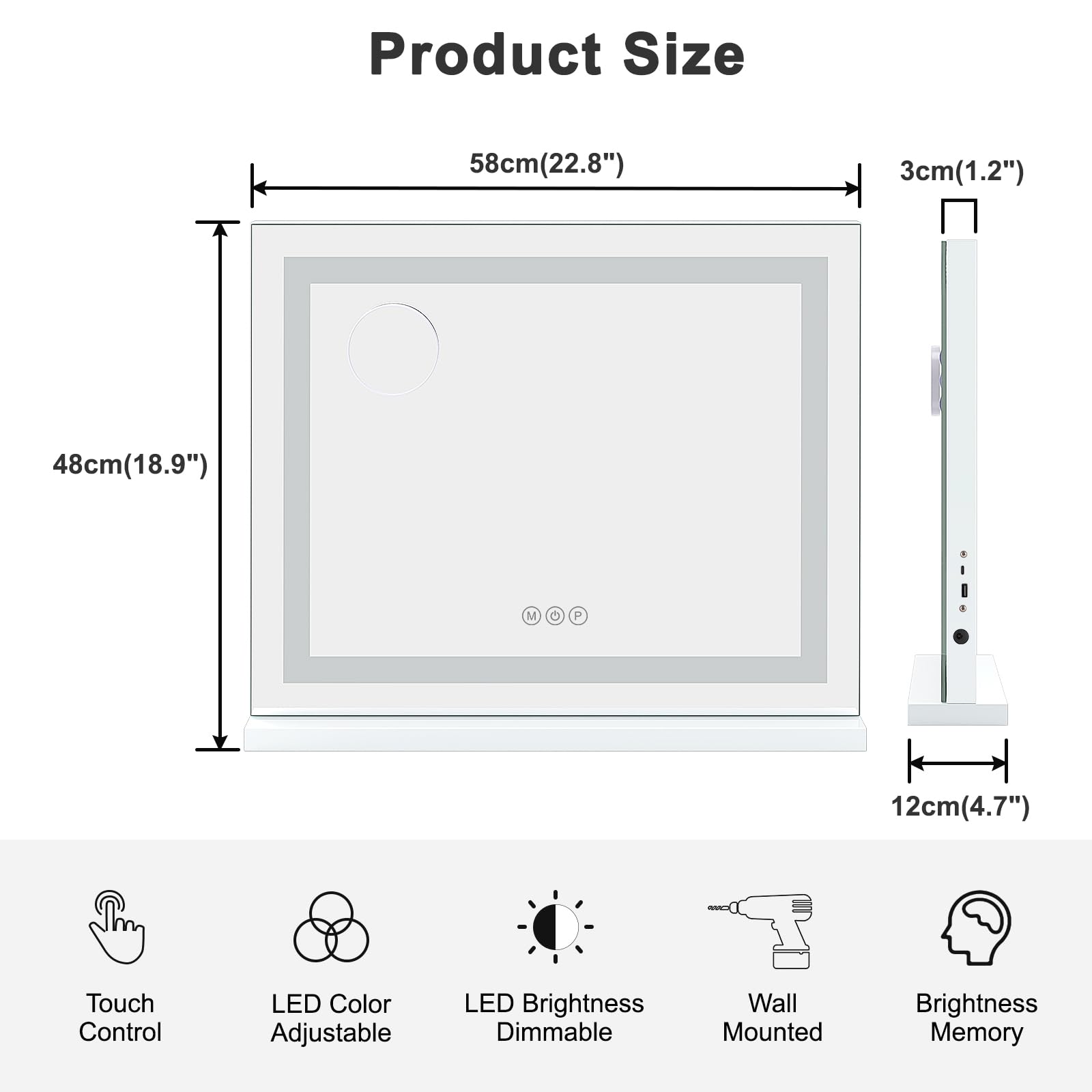 Dripex Hollywood Vanity Mirror with Light, 58 x 48 cm LED Makeup Mirror Light Up Vanity Mirror with 3 Colors Dimmable Strip Light, USB and Type-C Port, Tabletop or Wall-Mounted,